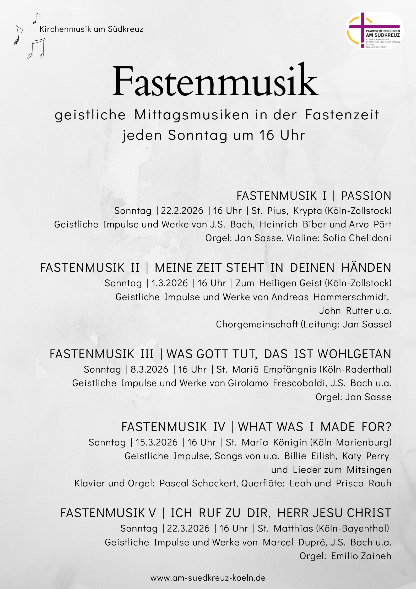 Die erste Fastenmusik findet am 22. Februar in der Krypta von St. Pius (Köln-Zollstock) statt. Unter dem Titel „Passion“ erklingen u.a. barocke Violinsonaten von Heinrich Ignaz Franz Biber und Werke von Johann Sebastian Bach und Arvo Pärt. Violine spielt Sofia Chelidoni, Orgel spielt der Seelsorgebereichsmusiker Jan Sasse. Die weiteren Termine der Fastenmusik finden Sie auf dem Plakat unten im Link. Ich möchte Sie ganz herzlich zur Fastenmusik-Reihe einladen! Ihr Jan Sasse, Seelsorgebereichsmusiker