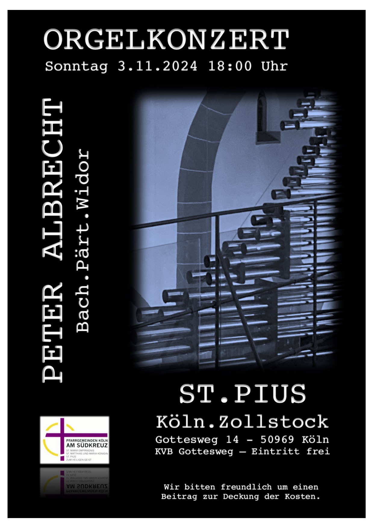 Seniorentreff im Klön CaféAn jedem letzten Mittwoch im Monat finden Sie hier die Möglichkeit zu anregenden Gesprächen, Gedächtnistraining, gemeinsamem Singen, Beweglichkeitsübungen, Gesellschaftsspielen, kreativem Tun, Besichtigungen, Ausflügen in die nähere Umgebung. Natürlich gibt es auch Getränke und selbstgebackenen Kuchen. Nächster Termin ist Mi, der 30. Oktober 2024, von 14:30 bis 17:30 Uhr im „Rosa Haus“, Mathiaskirchplatz 7, Köln/Bayenthal. Karten für die Pfarrkarnevalssitzung St. Matthias und Maria KöniginFür die Pfarrkarnevalssitzung St. Matthias und Maria Königin am So, den 09.02.2025, können ab dem 1. November 2024 Karten unter www.pfarrsitzung.de oder unter 0163-6345746 bestellt werden. Die Sitzung findet im Irmgardis Gymnasium ab 14:14 Uhr statt. Herzliche Einladung zum Orgelkonzert![]() Herzliche Einladung zum Orgelkonzert am Sonntag, den 03. November 2024, um 18:00 Uhr in der Kirche St. Pius. Unser Seelsorgebereichsmusiker Peter Albrecht spielt Werke von Bach, Pärt und Widor. Der Eintritt ist frei. GlaubensgesprächDas nächste Glaubensgespräch findet am Mi, den 13. November 2024, von 19:30 - 21:00 Uhr im Pfarrzentrum Zum Heiligen Geist (Zollstockgürtel 33) zum Thema "Heilige und ihre Verehrung" statt. Sie sind in der offenen Runde herzlich willkommen.